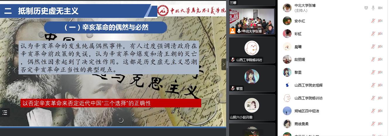 11月8日,中北大学马克思主义学院联合朔州市教育系统在学院会议室线上线下同步举办了“大中小学思政课一体化”集体备课活动,本次活动的主题是“抵制历史虚无主义 对辛亥革命的再认识”。参加本次活动的有特邀专家中国人民大学马克思主义学院侯衍社教授,中北大学马克思主义学院党委书记段义权、院长赵笑蕾、副院长郭玲霞和“中国近现代史纲要”基础教学部教师以及山西工学院、朔州市中小学思政课教师代表。