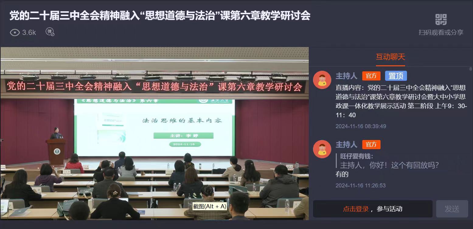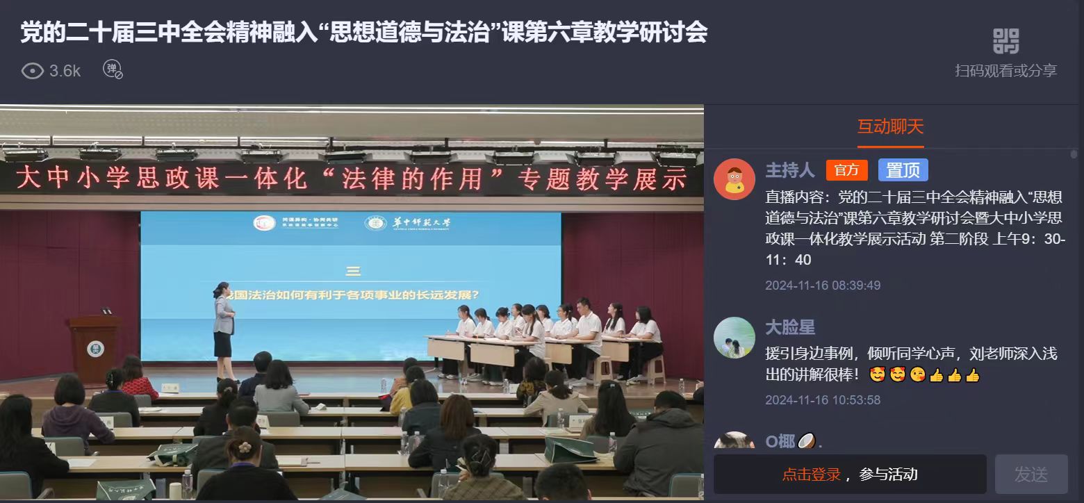为深入学习贯彻党的二十届三中全会精神,贯彻落实习近平总书记关于思政课建设的重要批示和新时代学校思政课建设推进会精神,坚持思政课建设与党的创新理论武装同步推进,加强“思想道德与法治”课程建设和大中小学思政课一体化建设,“思想道德与法治”基础教学部全体教师和山西省大中小学思政课一体化朔州片区教师于11月16日在线学习了由思政课教学创新中心举办的党的二十届三中全会精神融入“思想道德与法治”课第六章教学研讨会暨大中小学思政课一体化教学展示活动。