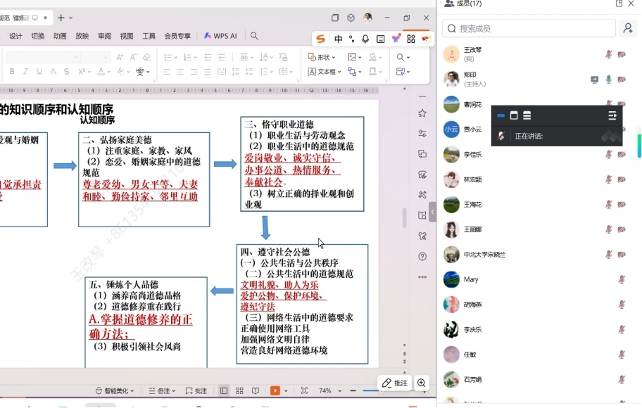 “思想道德与法治”基础教学部郑印老师做了“课程知识顺序与学生认知顺序的反思”的主题分享。郑老师从课程逻辑到授课逻辑的灵活处理,对本门课程知识顺序进行了教学反思。以第六章第三节为例,展示如何调整课程逻辑为授课逻辑。从学生感兴趣的恋爱和情感开始,扩展至家庭、职业以至于扩展到社会的认识顺序,在实践中收到了学生的良好反馈,基础教学部其他老师纷纷表达同感强烈,就该主题发表了自己的看法和做法。与会老师在这个主题上的教学经验互相融合,取长补短,取得了积极的成果。
