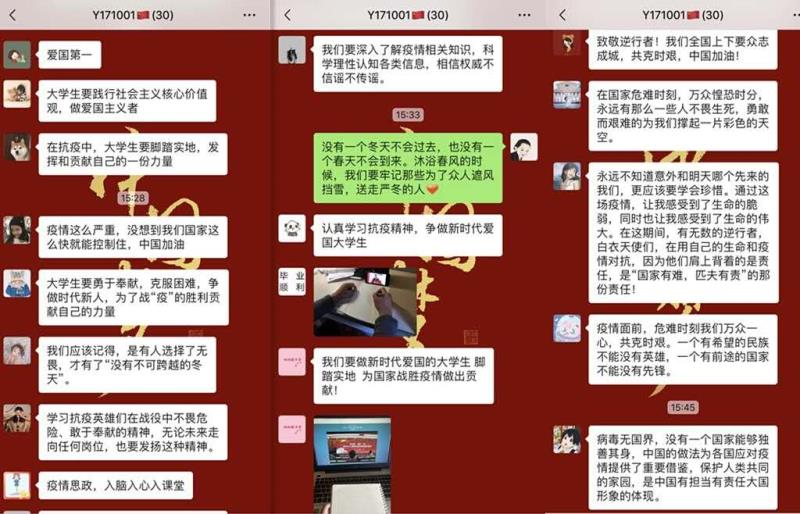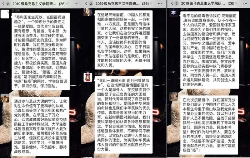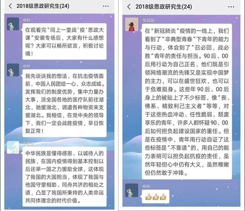 我院学生课后围绕战“疫”的思考和感悟展开了热烈的讨论。大家表示在疫情中展现了青年一代的责任和担当,更考验了国家治理体系和治理能力现代化,充分彰显了中国共产党的领导能力和中国特色社会主义制度的显著优势。此次思政大课也为同学们提供了一次成长和思想升华的良好契机,激发了我院学子爱党爱国爱社会主义的深厚情怀。希望大家通过此次学习,充分汲取思想养分,在党和人民最需要的地方书写自己最炫丽的青春。