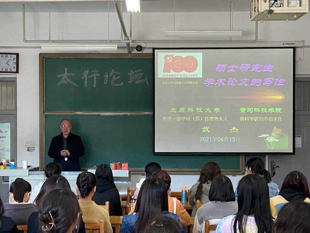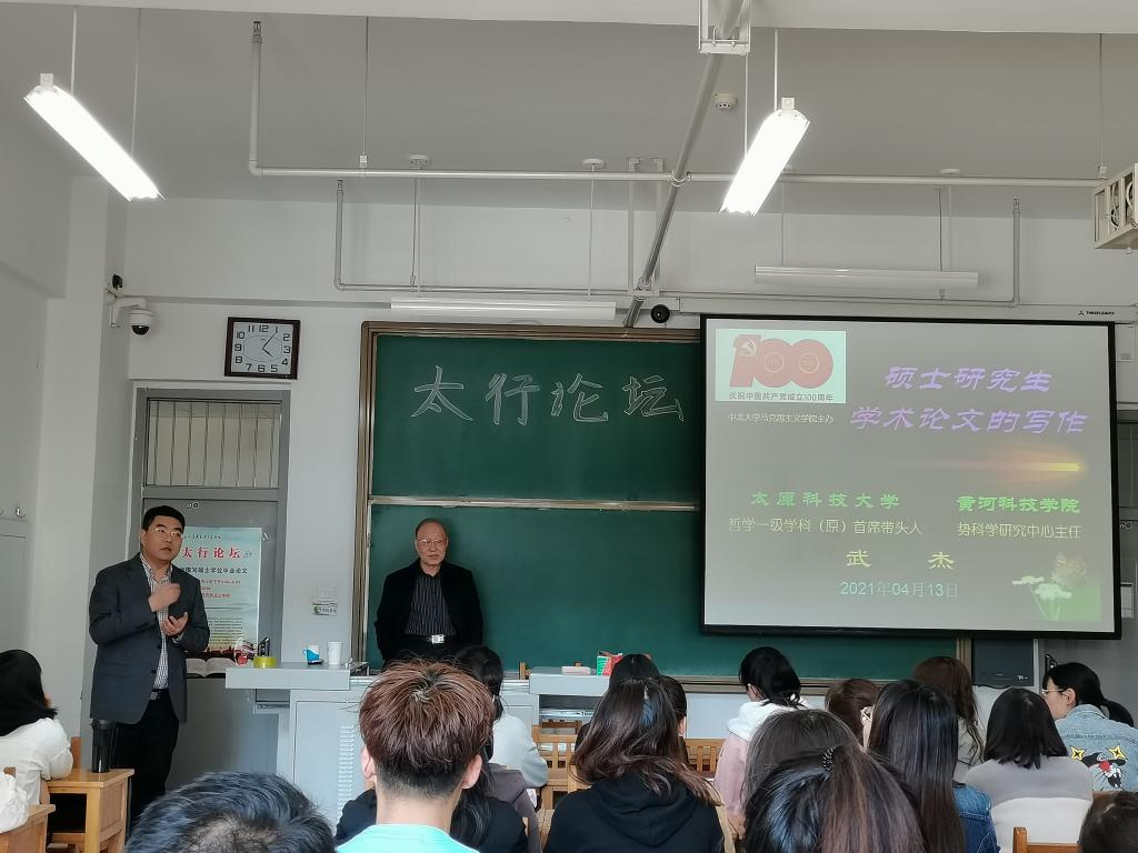 马克思主义学院于2021年4月13日在逸夫楼15209H举办了太行系列讲座,本次论坛主题为《如何撰写硕士学位毕业论文》,主讲人为历任太原科技大学人文社会科学系主任、党委组织部部长、哲学一级学科首席带头人,现任山西省高校教学指导委员会委员、山西省自然辩证法研究会副理事长、山西省社会学会副会长、《系统科学学报》编委的武杰教授。论坛由马克思主义学院杜刚副院长主持,马克思主义学院全体在校研究生参与了本次论坛。