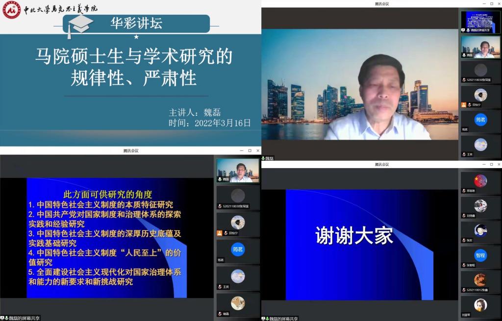 2022年3月16日,马克思主义学院举办了以“马院硕士生与学术研究的规律性、严肃性”为主题的线上研究生华彩讲坛。本次讲坛的主讲人是党的建设专业教授,现任中共山东省委党校政党比较研究中心主任,对马克思主义政党理论与执政党建设、政党政治与政党制度比较等领域有深入研究的魏磊教授。我院全体硕士研究生参加了本次讲坛。