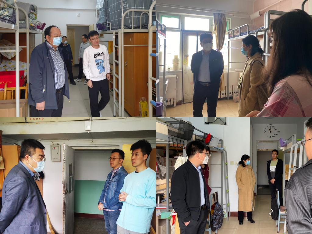 为进一步增强我院研究生的疫情防控意识,排查宿舍安全隐患,切实执行学院包联机制,落实导师尽责要求,有效实现网格化管理,提高已返校学生宿舍安全防范意识,4月14日,马克思主义学院党委书记段义权、院党委副书记李庆乐、副院长杜刚、副院长郭玲霞及教师代表刘继荣老师对我院返校研究生的宿舍进行了防疫检查。