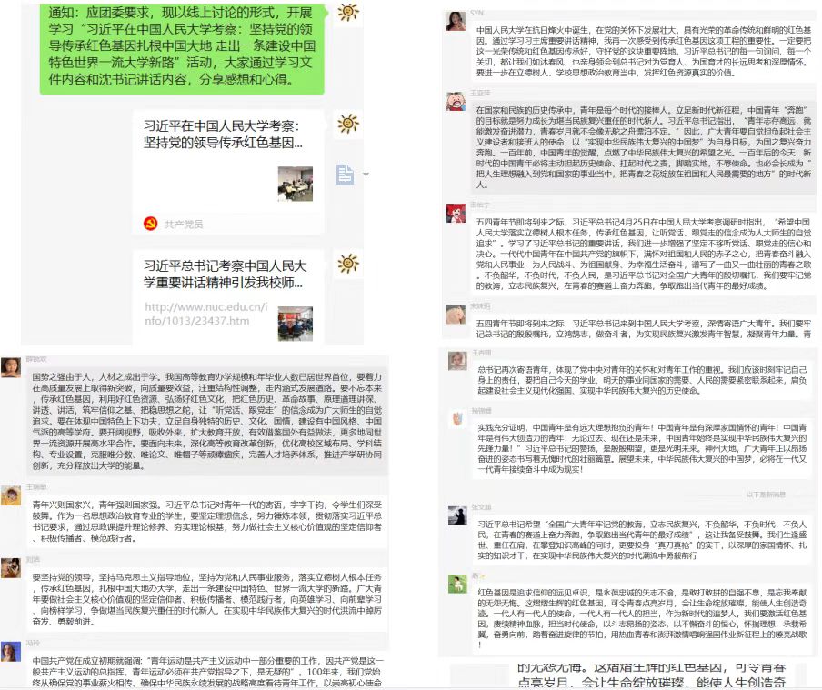 在五四青年节即将到来之际,习近平总书记4月25日上午来到中国人民大学考察调研。习近平总书记代表党中央,向全国各族青年致以节日的祝贺,向中国人民大学全体师生员工、向全国广大教育工作者和青年工作者致以诚挚的问候,并主持召开师生代表座谈会。4月26日至28日,我院研究生各团支部组织学习了习近平总书记在中国人民大学考察时的重要讲话,深刻领会了其中蕴含的精神,这番深情寄语在我院团员青年中引发热议。