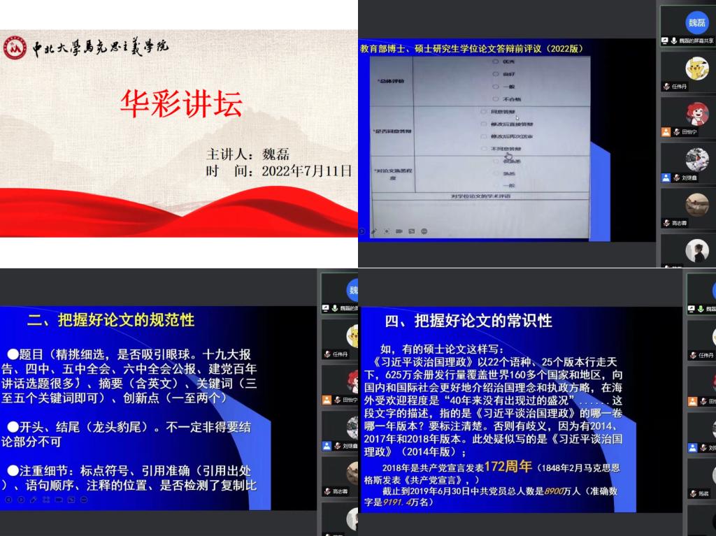 为了提升我院研究生学术论文写作的专业性、科学性和严谨性,2022年7月11日,马克思主义学院举办了以“撰写一篇高质量的硕士生毕业论文”为主题的第1818期研究生华彩讲坛。本次讲坛的主讲人是中共山东省委党校政党比较研究中心主任,山东党校校报副总编,中共山东省委宣讲团成员魏磊教授,辅导员刘莉莉老师主持了会议,我院全体研究生参加了本次活动。