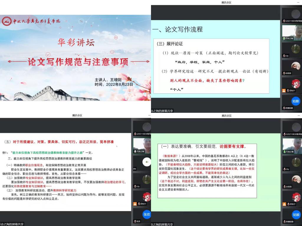 一篇好的学术论文,不仅要有独到的见解、逻辑清晰的分析论证,还应该有严谨的结构和层次,同时也不能忽视语句的通顺、标点用词的准确。为此,马克思主义学院于2022年8月23日举办了以“论文写作规范与注意事项”为主题的第1820期华彩讲坛。本次讲坛的主讲人是山西师范大学马克思主义学院副教授王增剑老师,我院辅导员刘莉莉老师主持了会议,全体研究生参加了此次讲座。