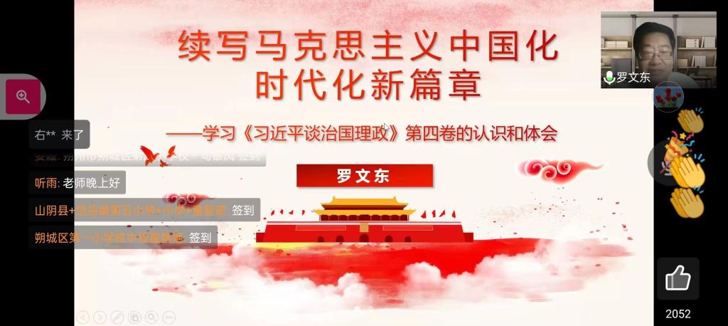 两天时间内,罗文东教授围绕《习近平谈治国理政》第四卷分别从四个方面进行了分享。第一,介绍了第四卷所反映的时代背景、历史条件和编撰特点。第二,分析了第四卷的主题主线和逻辑结构。他强调指出,第四卷继续反映坚持和发展中国特色社会主义这一主题和“五加四加三格局”。第三,重点阐释了推进马克思主义中国化时代化的最新理论成果。第四,从国际、国内两个角度,分析了第四卷的理论意义以及实践意义,即实现民族复兴建设美好世界的科学指南。他指出,第四卷生动记录了以习近平同志为核心的党中央领导全党全国人民决胜全面建成小康社会、开启全面建设社会主义现代化国家新征程的伟大实践探索,集中体现了中国共产党人坚持和发展马克思主义的最新理论成果,为国际社会了解中国、读懂中国,加深对中国之路、中国之治、中国之理的认识和认同,打开了一扇“思想之窗”;为干部群众深刻领会“两个确立”,增强“四个意识,坚定“四个自信”,做到“两个维护”,在新时代新征程上团结奋斗,勇毅前行,具有十分重要的理论意义和现实意义。