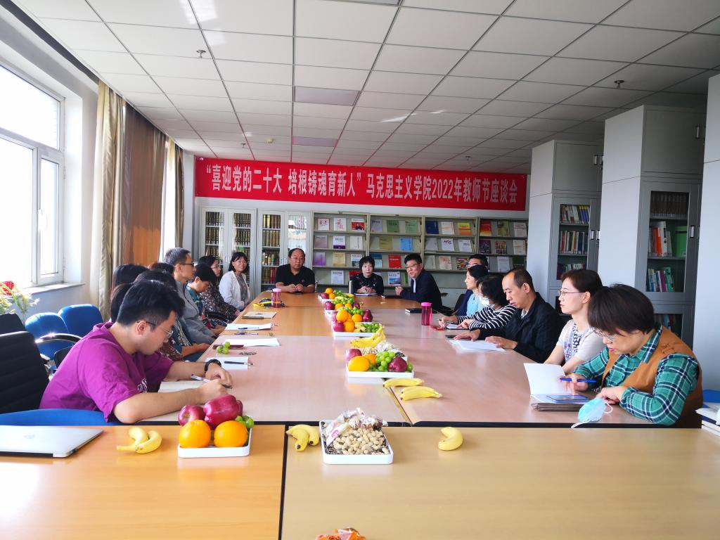 在第38个教师节即将来临之际,9月8日上午,马克思主义学院在学院资料室举办“喜迎党的二十大,培根铸魂育新人”2022年教师节座谈会。学院全体领导班子成员、退休教师、正高职称教师代表、部分骨干教师代表以及新入职教师参加座谈会。座谈会由学院党委副书记、副院长李庆乐主持。