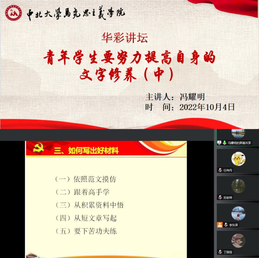为加强我院研究生文字功底,提升我院研究生写作水平,10月4日晚,马克思主义学院举办了以“青年学生要努力提高自身的文字修养”为主题的研究生华彩讲坛,讲座由山西省委党校报刊社社长冯耀明老师主讲,刘莉莉老师主持,我院全体师生参加了此次讲坛。