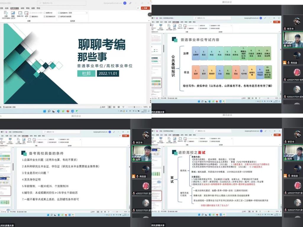 分享会一开始,杜邦学长从讲述自己的上岸之路出发,强调临近毕业时一定要调整好自己的心态,先毕业再就业。之后,学长又围绕就业方向展开讲述,针对普通事业编、思政教师岗以及行政管理岗三个方向的不同考试形式进行一一说明,建议大家无论是考普通事业单位还是高校,要先了解考试形式,均衡取舍后有针对性的备考。同时,杜邦学长分享了获取事业单位信息来源的途径,例如可以通过公众号及官方网站等平台及时了解就业信息。此外,杜邦学长还详细阐述了事业编的考试内容、学习方式、考试流程及注意事项,并鼓励大家相信自己,从容应对。最后,学长针对同学们提出的问题耐心答疑解惑,会上讨论气氛热烈,同学们收获颇丰。