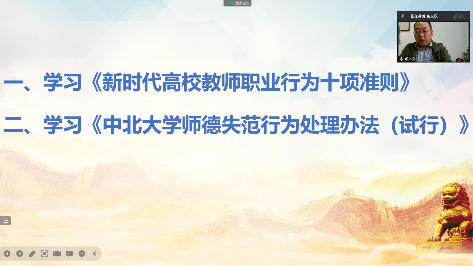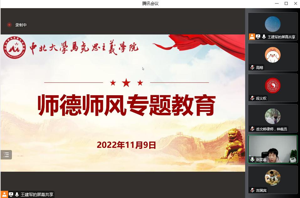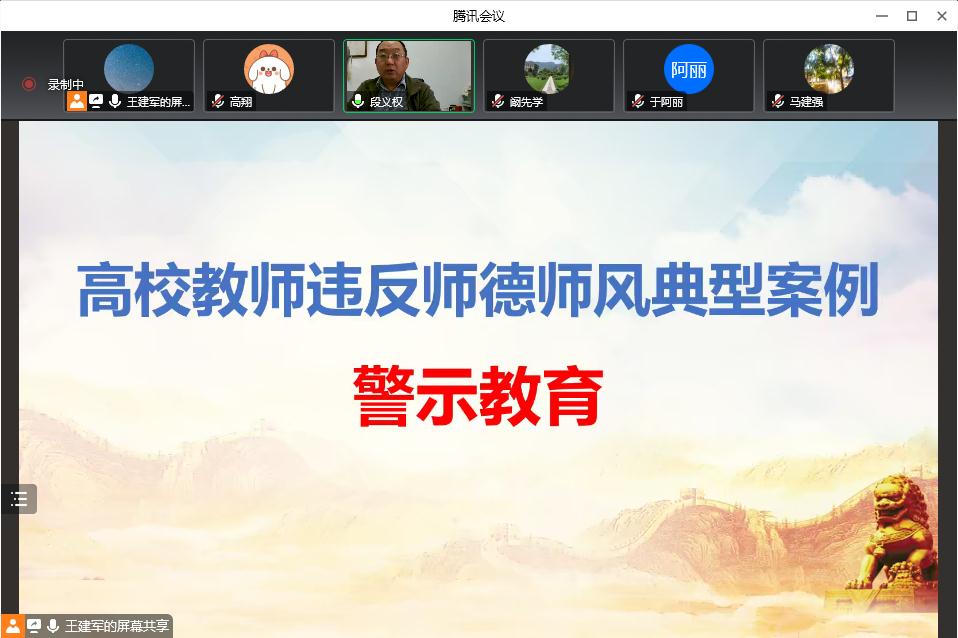 2022年11月9日下午,马克思主义学院通过“腾讯会议”在线召开师德师风专题教育大会,学院领导和全体教职工参加会议。