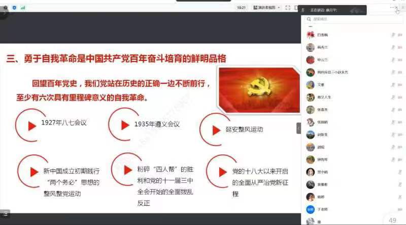 中北大学康月平老师从什么是革命引出党的自我革命的内涵,从党的自我革命论述是习近平新时代中国特色社会主义思想的重要组成部分、勇于自我革命是中国共产党百年奋斗培育的鲜明品格、百年大党以自我革命引领伟大社会革命的历史经验几个方面深刻阐释了“牢牢把握以伟大自我革命引领伟大社会革命的重要要求”这一主题。