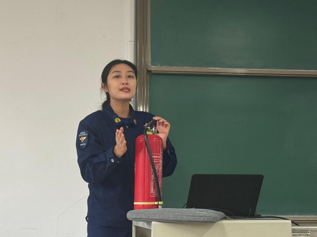 讲解员从消防安全知识和逃生自救方法两方面展开,以校园常见的电动车和实验室起火案例为切入点,对火灾的定义、校园防火常识、火灾致人伤亡的因素、消防器材类型及灭火器的使用方法进行详细讲解。最后,讲解员通过播放火灾警示教育片和趣味消防公益宣传片,指导在场师生面对突发火灾事故时个人如何进行救灾与逃生,保护生命和财产安全。