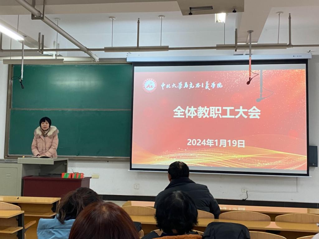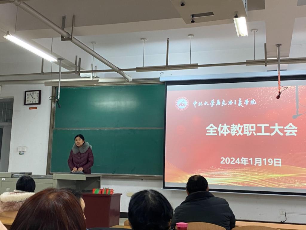 赵笑蕾院长从学科建设、思政课教学、科学研究、人才引育、学术交流等方面简要回顾了学院2023年的工作。她指出,一年来,学院各项事业发展均取得了新进展:学院成功入选山西省重点马克思主义学院;教学成果、科研成果、思政课教学展示斩获省级大奖;省级教改立项、科研课题立项、论文发表均取得新突破;同时在实践教学、大中小一体化建设、学术交流、人才引育等方面工作成效明显。赵笑蕾对学院中长期发展规划做了展望,对学院即将面临的学科升级重要任务作了部署,对存在的主要问题进行了分析并提出了改进要求。她强调,学院要紧紧围绕学校“双一流”创建目标和“十四五”规划,切实落实立德树人根本任务,鼓足干劲、提振信心、主动作为、努力奋斗,持续推进学院发展再上新台阶。