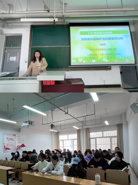 为培养学生法制意识,提升学生法治思维,切实帮助学生维护自身合法权益,马克思主义学院于2024年3月14日在15103H教室举办了以“消费者权益保护法经典案例分析”为主题的普法知识讲座。本次讲座由马克思主义学院教师、上海段和段太原律师事务所律师王改琴主讲,马克思主义学院全体学生参加。