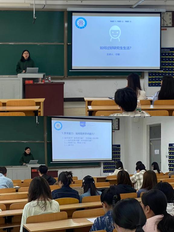 任老师以研究生生活为主题,结合自己的学术经验,围绕“学术能力”、“职业规划”、“心态调整”这三方面展开讲解。任老师指出,培养学术能力就要求我们在读书时精读与泛读相结合,为将来的学术探索和创新奠定坚实基础。同时,要早做职业规划,积极参加社会实践活动,以拓展视野、积累经验。最后,任老师嘱咐大家在遇到挫折时,要学会用积极的思维方式调整和激励自己,保持乐观向上的心态,不断实现自我成长和进步。