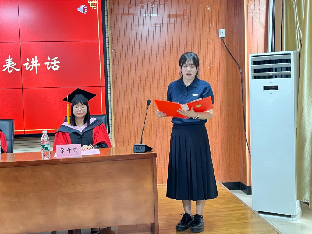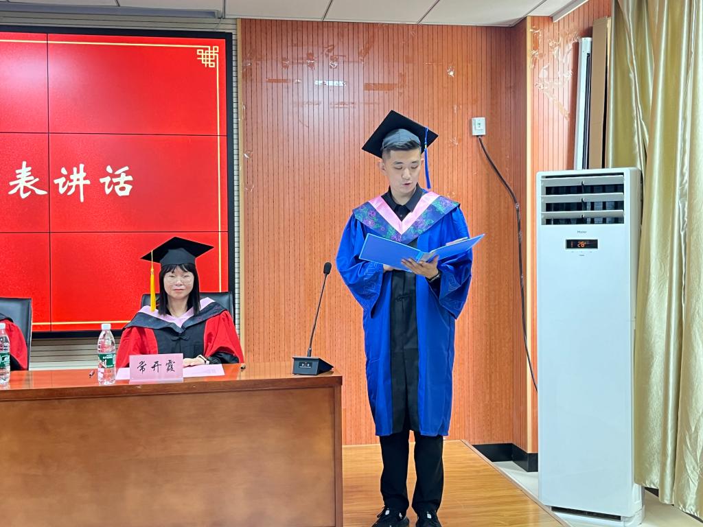 来姝男同学代表全体在校生向2024届毕业生表示衷心的祝贺与感谢,感谢师兄师姐们给予的生活与学习上的帮助,并表示将以他们为榜样,用汗水和智慧浇灌知识土壤,用坚韧和毅力书写青春篇章。