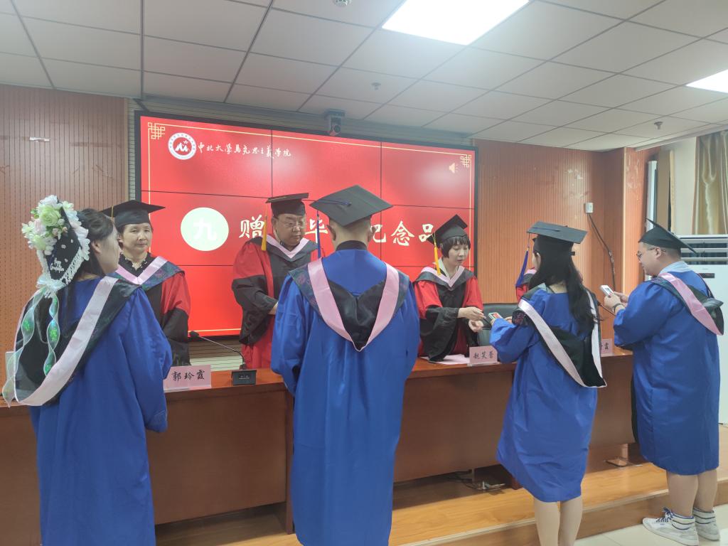 院领导为毕业生赠送毕业纪念品并与同学们合影留念,这既是同学们在这里度过宝贵时光的留念,也是对大家未来道路的祝福。