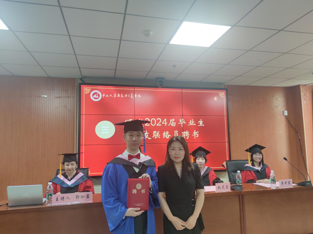 为凝聚校友力量,发挥校友资源的作用,搭建校友与母校沟通的桥梁,院团委书记刘莉莉老师为2024届毕业生校友联络员张智程同学颁发聘书,希望能不忘初心,持续为校友们提供支持和服务。