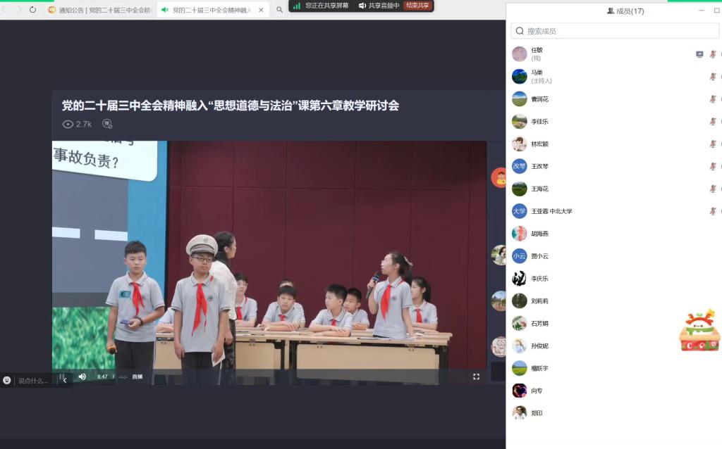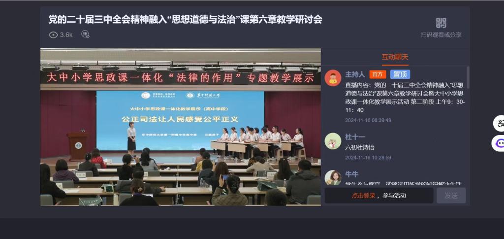 为深入学习贯彻党的二十届三中全会精神,贯彻落实习近平总书记关于思政课建设的重要批示和新时代学校思政课建设推进会精神,坚持思政课建设与党的创新理论武装同步推进,加强“思想道德与法治”课程建设和大中小学思政课一体化建设,“思想道德与法治”基础教学部全体教师和山西省大中小学思政课一体化朔州片区教师于11月16日在线学习了由思政课教学创新中心举办的党的二十届三中全会精神融入“思想道德与法治”课第六章教学研讨会暨大中小学思政课一体化教学展示活动。