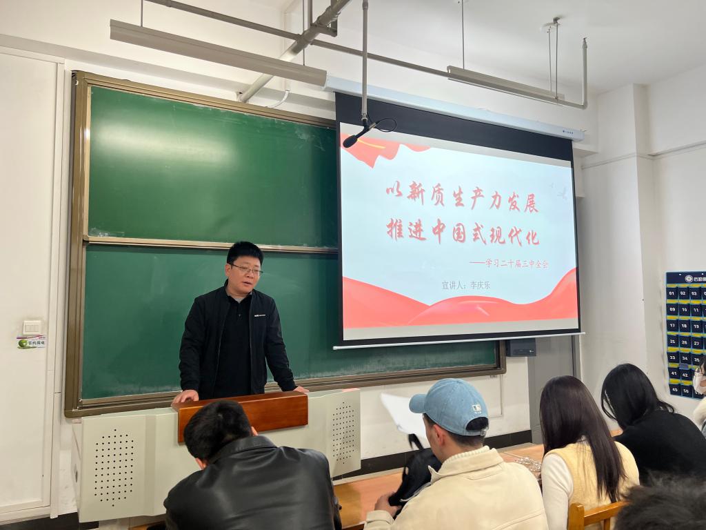 为推动学习贯彻党的二十届三中全会精神走深走实,激发青年学生的改革创新动力,11月21日,马克思主义学院思想政治教育专业研究生党支部以及数学学院研究生第一、第二党支部全体党员联组共学共同学习党的二十届三中全会精神。本次学习的主题为“以新质生产力发展推进中国式现代化”,学习由马克思主义学院党委副书记李庆乐主讲。