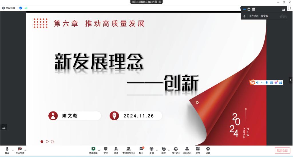 “马克思主义基本原理”基础教学部由来我院访学的陈文璇老师主讲“新发展理念—创新”。张科晓、张胜旺等老师进行了点评。陈老师还讲述了在中北大学访学研修期间的感受和心得。陈老师说,经过一学期的听课、助课和参加各种教学活动,自己增长了见识,提高了水平,收获颇丰,对自己今后的教学工作帮助很大。
