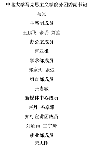 中北大学马克思主义学院研究生会是我院学生自我管理、自我服务、自我教育的学生组织。为进一步深化我院研究生会体制改革,加强我院研究生会的组织建设,让研究生会成为激发学生活力、促进健康发展的优秀学生组织,根据中北大学校团委及学生工作部有关规定,我院研究生会本着“公平、公正、公开”的原则进行了中北大学马克思主义学院分团委及第四届研究生会学生干部选举工作,经个人申请、资格审查、岗位锻炼、竞选答辩等多轮综合素质考察环节,现将名单予以公示,公示期为5天。公示期间如有异议,请联系3921202。