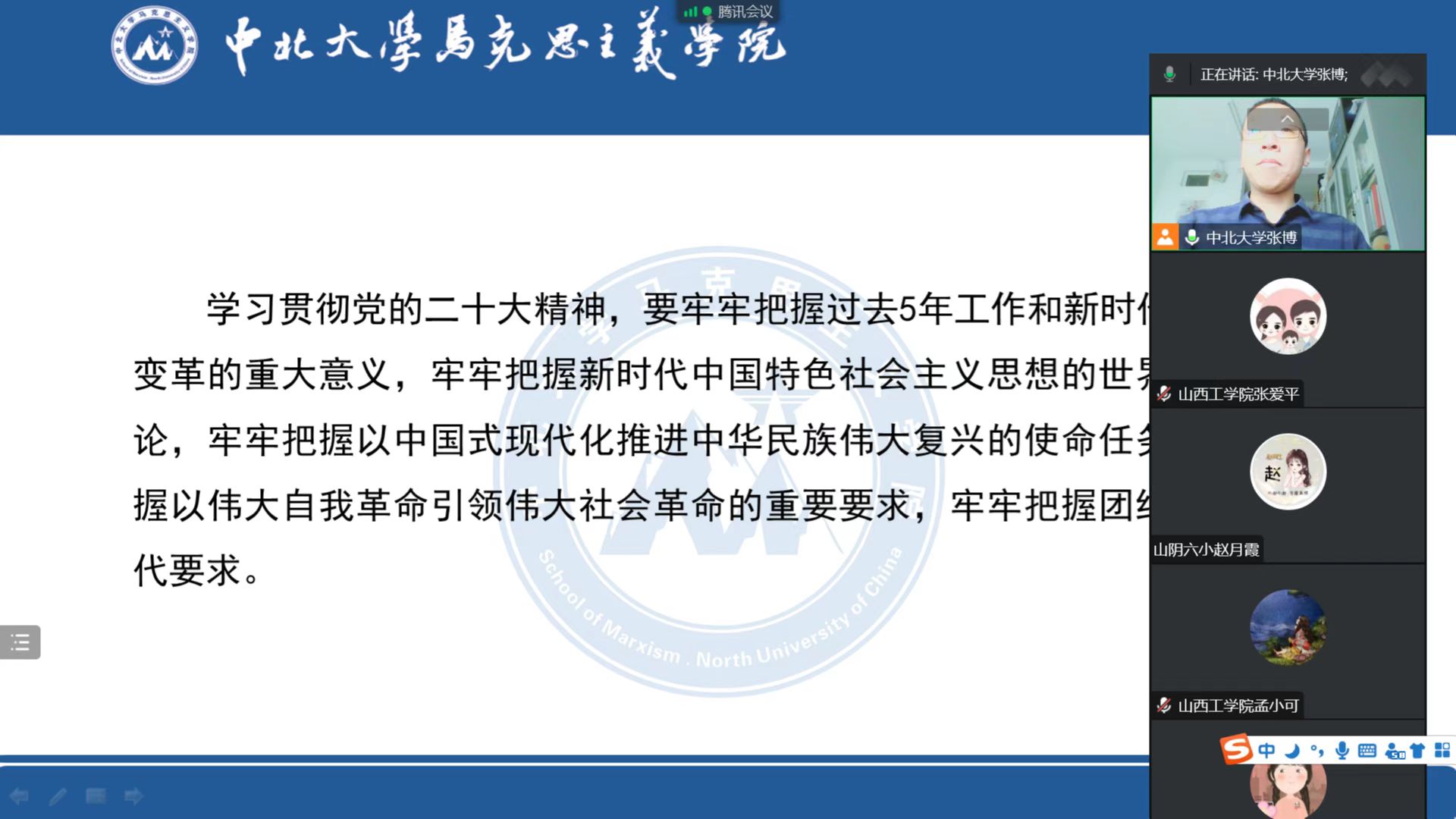 为了更好地学习党的二十大精神,提升思政课教学效果,推动大中小学思政课一体化建设,2022年12月6日下午4点,马克思主义学院联合朔州市教育系统共同举办了“牢牢把握过去五年工作和新时代十年伟大变革的重大意义”为主题的集体备课活动。马克思主义学院“中国近现代史纲要”基础教学部所有教师、山西工学院部分思政课教师、朔州市山阴县中小学思政课教师参加了此次活动。