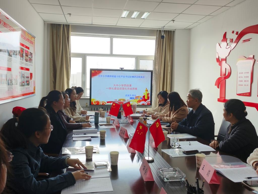 郭玲霞副院长就马院建设、思政课建设情况进行了详细介绍。与会教师代表回顾了习近平总书记“3.18”重要内容,围绕习近平总书记“3.18”重要讲话精神,以大中小学一体化思政课教学为主题展开讨论,分享了自己对思政课大中小学一体化教学的困惑、经验和感受。