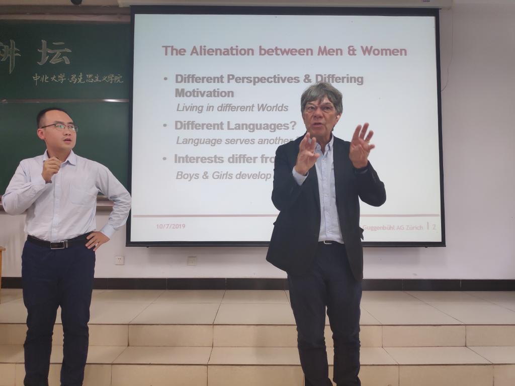 2019年10月7日,中北大学马克思主义学院在逸夫楼15102H举办了华彩讲坛·太行论坛(系列二),本次论坛的主题是“男人、神话和权力”,主讲人Allan Guggenbuehl教授来自瑞士苏黎世大学,是国际精神心理剧学会主席、神话心理剧的创始人、国际“冲突”解决专家。我校赵丹凤老师主持了本次讲座。
