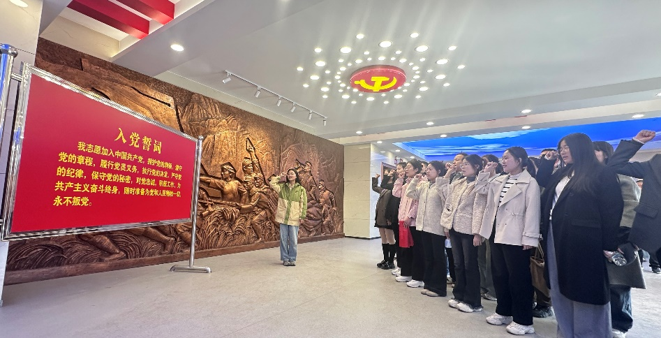 祭扫仪式结束后,师生们纷纷步入展览馆。在讲解员的引导下,通过一幅幅历史照片、一件件珍贵实物、一段段感人故事,深入了解太原军民在革命战争年代同仇敌忾、共御外侮的光辉历程,以及新时代双拥共建的丰硕成果。随后,全体党员来到纪念馆大厅,庄严地举起右拳,重温了入党誓词,铿锵地誓言回荡在大厅内,传递着传承红色精神的坚定信念。