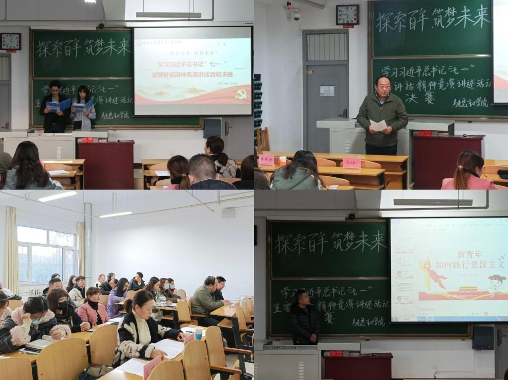 为深入学习习近平总书记“七一”重要讲话精神,推动党史学习教育走深走实,11月8日,马克思主义学院研究生在15104教室举行学习习近平总书记“七一”重要讲话精神竞演活动决赛,马克思主义学院党委书记段义权、党委副书记李庆乐、辅导员刘莉莉老师以及刘林凤老师担任本次活动的评委嘉宾。