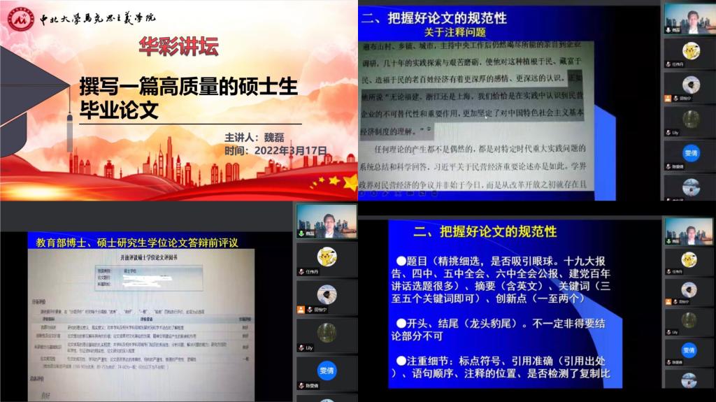 为提高同学们的论文写作水平,增强学术素养,马克思主义学院于2022年3月17日举办了以“撰写一篇高质量的硕士生毕业论文”为主题的线上研究生华彩讲坛,讲座邀请到了来自中共山东省委党校的魏磊教授做主讲。本次讲座由辅导员刘莉莉老师主持,我院全体研究生出席。