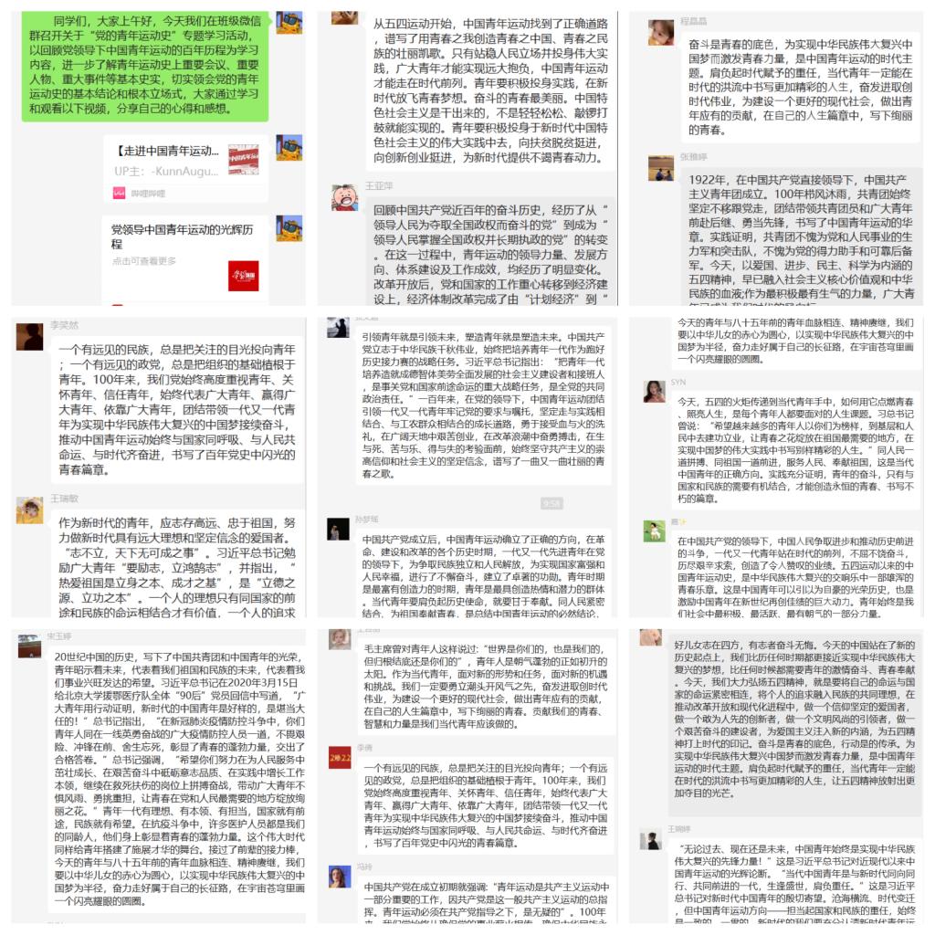 一个有远见的民族,总是把关注的目光投向青年;一个有远见的政党,总是把组织的基础植根于青年。为庆祝建团100周年,巩固拓展党史学习教育成果,引领我院团员青年深入研究党史“青年篇章”,把党的青年运动史学习好、总结好,把党的成功经验传承好、发扬好,4月12日至15日,马克思主义学院研究生各个团支部以线上讨论学习的方式开展了“党的青年运动史”专题学习活动。各班团支书向大家分享相关阅读资料及视频,团员青年们纷纷结合主题内容和现实意义,从多方面谈看法,悟感受,畅所欲言。