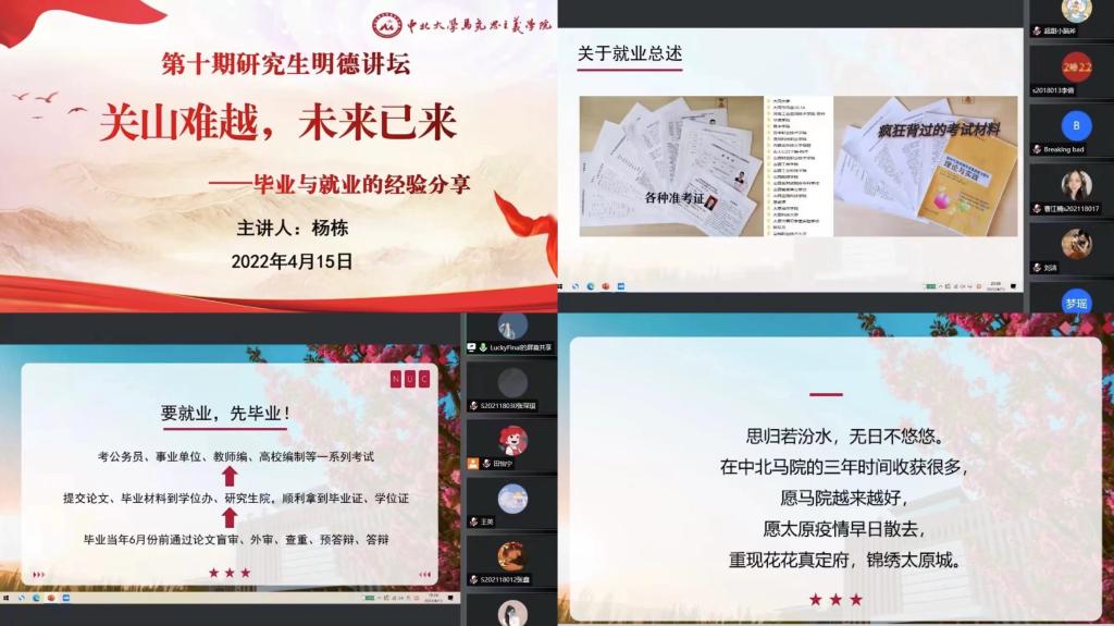 人生如逆旅,我亦是行人。为了进一步给我院学生提供就业指导,助力同学们日后更好地走入职场、走向社会,4月15日马克思主义学院举办了以“关山难越,未来已来——毕业与就业的经验分享”为主题的线上研究生明德讲坛。此次讲坛的主讲人是中北大学马克思主义学院2018级硕士生杨栋,现为太原城市职业技术学院在编教师。马克思主义学院全体研究生参加了本次讲坛。