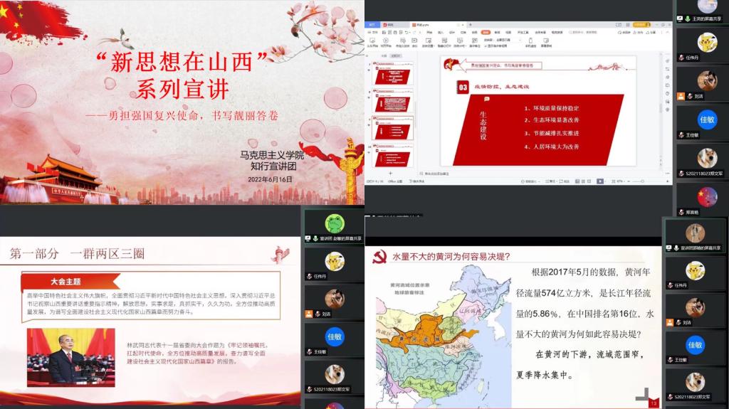 为了深入学习贯彻习近平总书记考察调研山西重要指示精神,进一步推进习近平新时代中国特色社会主义思想在三晋大地落地生根、开花结果,2022年6月16日,我院知行宣讲团成功举办了以“新思想在山西”为主题的宣讲活动,本次宣讲的主讲人是知行宣讲团成员王英、赵敏、郭婧三位同学。此次活动由知行宣讲团副团长刘洁同学主持,我院全体研究生参加了本次活动。