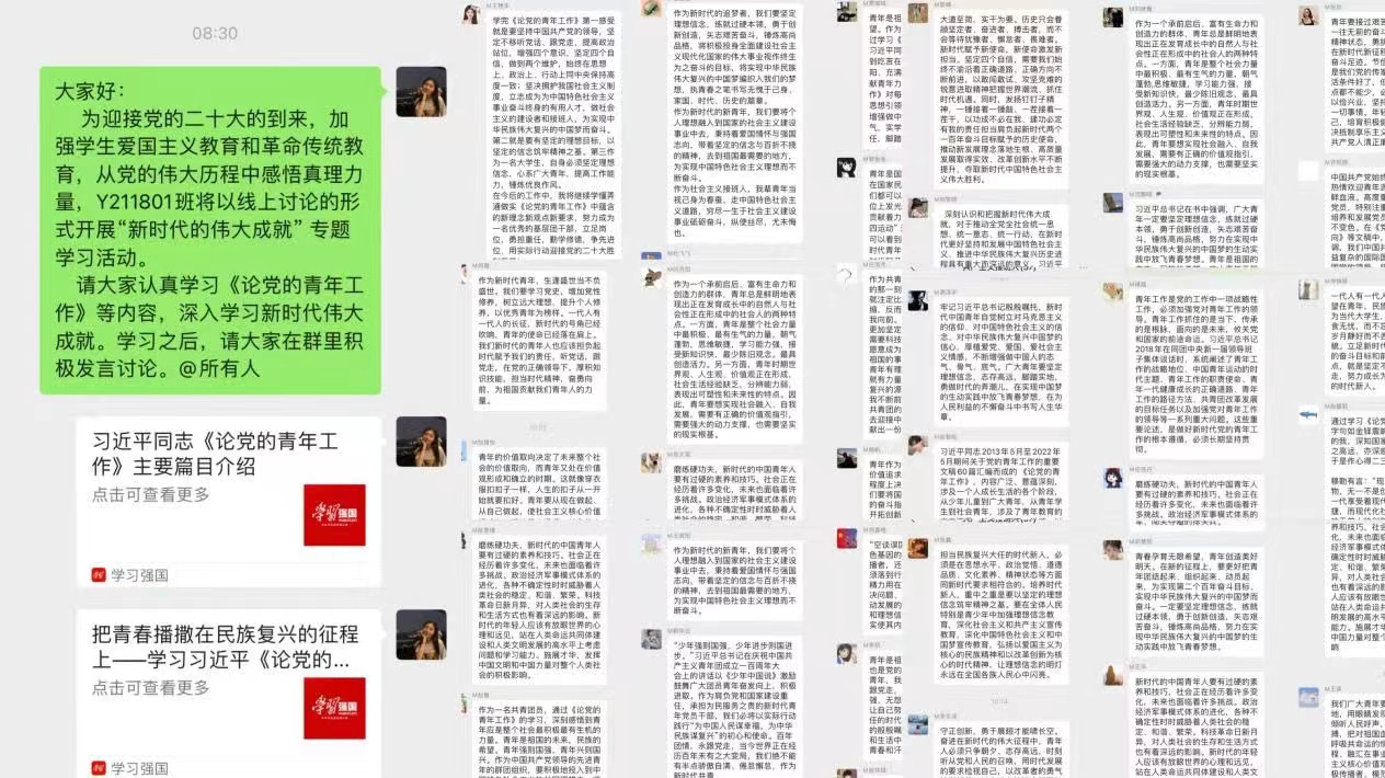 青年兴则国家兴,青年强则国家强。习近平总书记关于青年工作的重要思想立意高远、思想深刻、内涵丰富,是习近平新时代中国特色社会主义思想的重要组成部分。为了迎接中国共产党第二十次全国代表大会的到来,加强青年爱国主义教育和革命传统教育,引导团员青年从党的伟大历程中感悟真理力量,2022年9月14日,我院研究生各团支部以线上讨论的形式开展了“新时代的伟大成就”专题学习活动,同学们认真学习了《论党的青年工作》等理论内容,热情高涨,各抒己见。